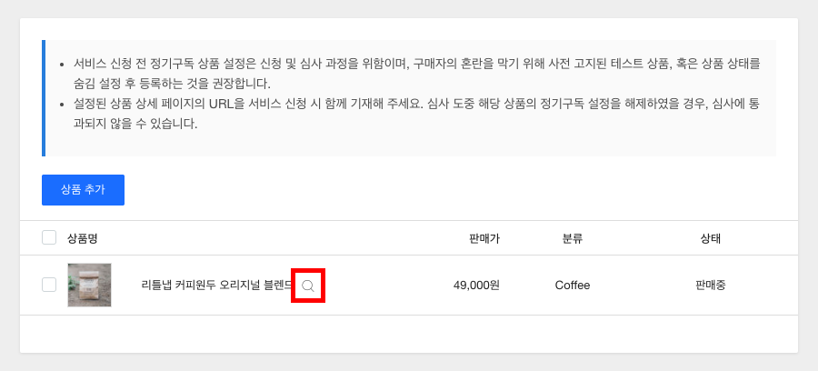 3단계 과정을 마치면 아래 그림과 같이 등록된 정기구독 상품이 표시됩니다. 여기서 상품명 끝에 표시된 돋보기 아이콘을 클릭합니다.