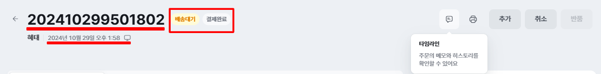 상단 우측에는 타임라인과 주문서 출력 버튼이 있어 클릭하여 실행하실 수 있어요. [주문관리v2 타임라인 확인하기] 가이드에서 자세한 내용을 확인해 보세요.