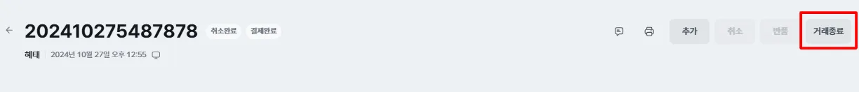반대로 거래 종료 버튼이 노출된다면 해당 버튼을 클릭해 종료 상태로 변경할 수도 있어요. 구매확정, 반품완료, 취소완료의 상태이면서 거래상태는 거래 중일 때 노출되는 버튼입니다.