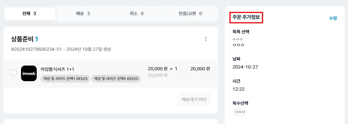 [결제 폼 관리 설정하기] 가이드를 따라 결제하기 페이지에서 추가 정보를 받으시는 경우, ‘주문 추가정보’ 영역이 노출되며 고객이 입력한 정보를 확인할 수 있어요.
