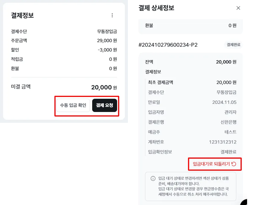 입금대기로 되돌리기: 무통장입금 주문 건을 수동 입금 확인하였으나, 다시 입금대기로 되돌리는 기능