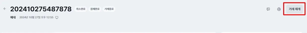 만약, 이미 거래가 종료된 주문이라면 “거래재개” 버튼만 노출되어요. 종료된 주문이더라도 추가, 반품, 취소 등의 처리가 필요하다면 거래재개 버튼을 클릭하신 후 진행해 보세요.