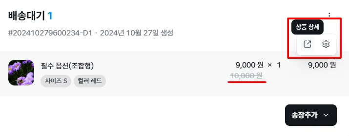 섹션 하단에는 다음 주문 처리를 위한 버튼이 노출되기에, 주문 상세페이지에서도 처리가 가능해요. (배송중 처리, 배송완료, 송장추가 등)