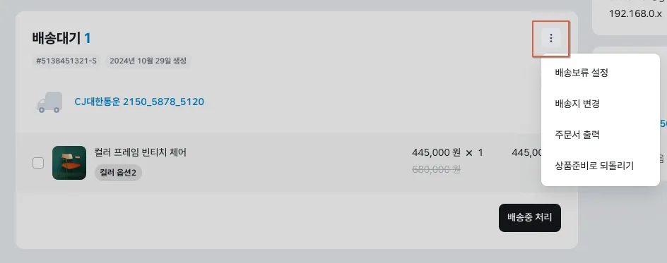 또한, 섹션 상단의 더보기(…) 버튼을 클릭하여 송장 번호를 수정 및 삭제하거나 이전 단계로 되돌려 보실 수 있어요. 노출되는 항목은 주문 상태에 따라 다릅니다.