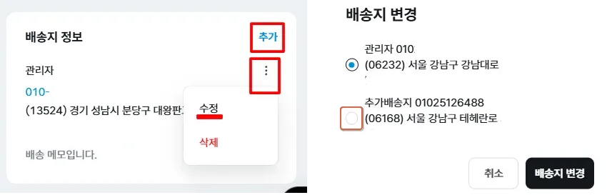 [주문 상세페이지 > 섹션 상단 더보기 버튼 클릭 > 배송지 변경 > 원하는 배송지로 선택]