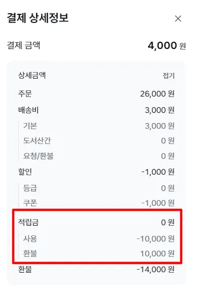 예) 사용 적립금 -10,000 / 환불 적립금 10,000 = 0원