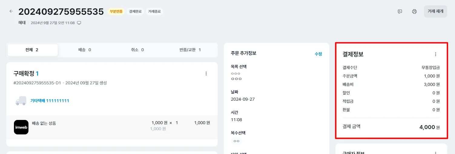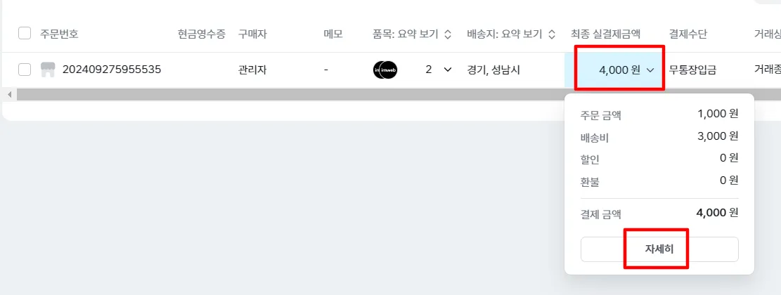 [관리자 페이지 > 쇼핑 > 주문관리v2 > 주문 상세페이지 > 결제정보]