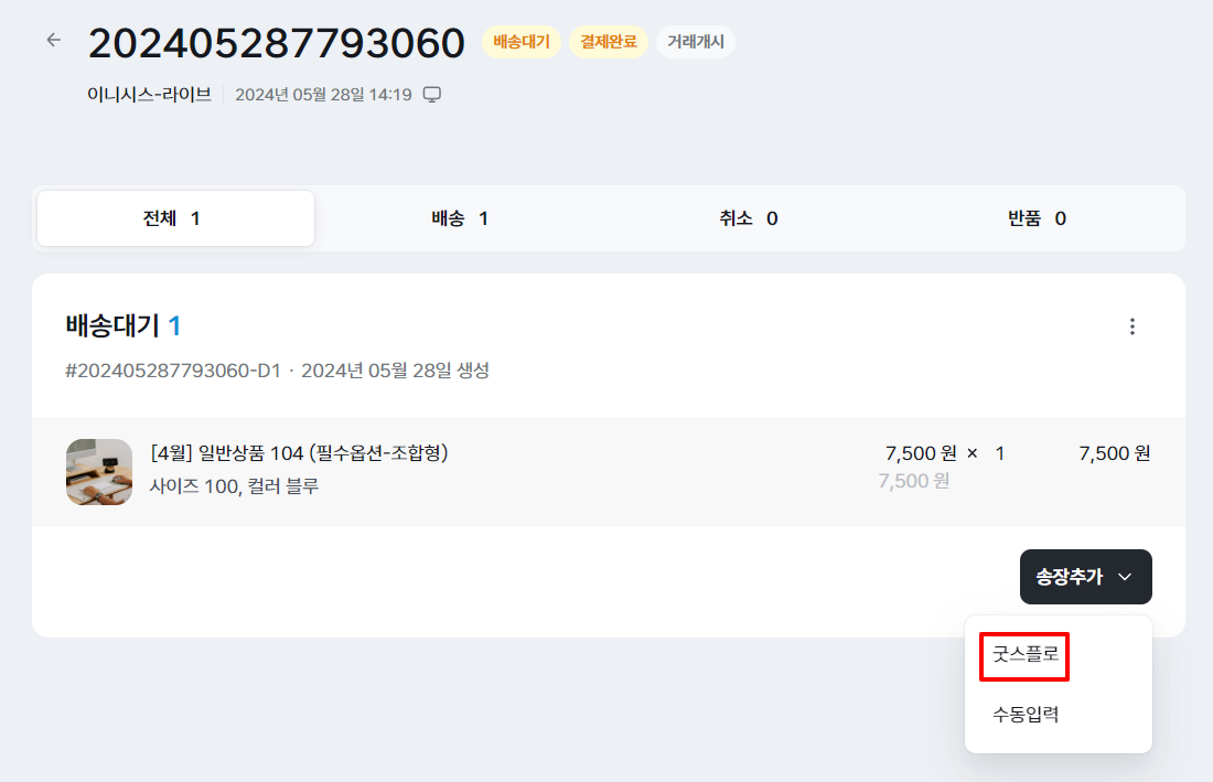 굿스플로 : 주문선택 → 하단 주문처리 버튼 클릭 → 송장등록-굿스플로 → {운송장 출력 화면 → 운송장 출력} → 자동으로 송장번호가 입력됨 → 배송대기 상태로 변경
