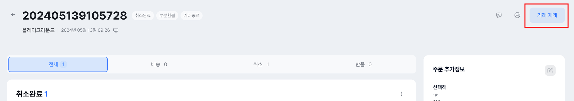 참고: 거래종료에서 거래재개가 안되는 경우 ⇒ 새 주문으로 진행이 필요합니다.입금 전에 취소를 했거나, 결제기한초과로 자동 취소 된 주문은 거래재개가 불가합니다.