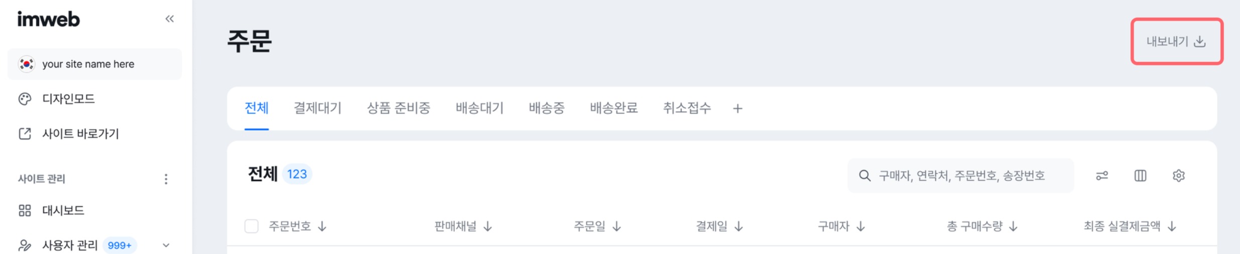 1. [관리자 페이지 > 쇼핑 > 주문관리v2] 상단의 "내보내기" 버튼을 클릭합니다.