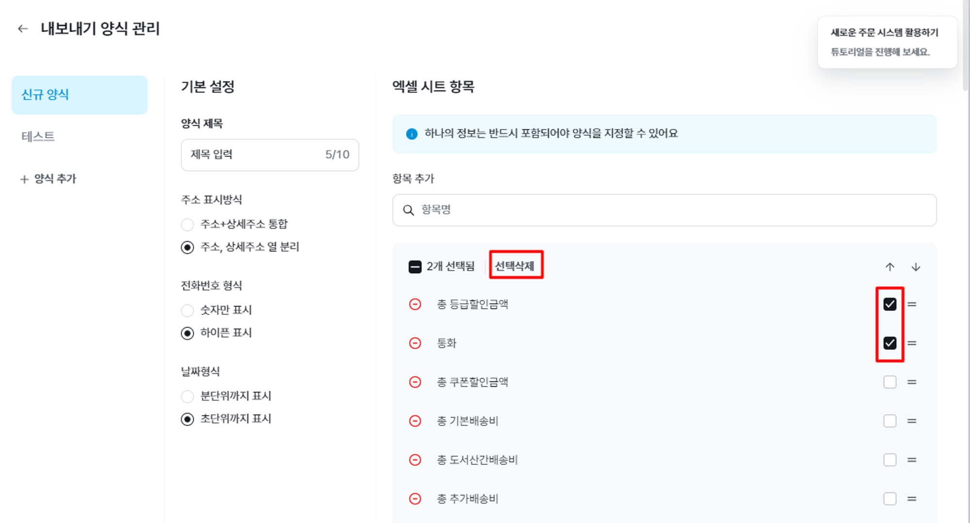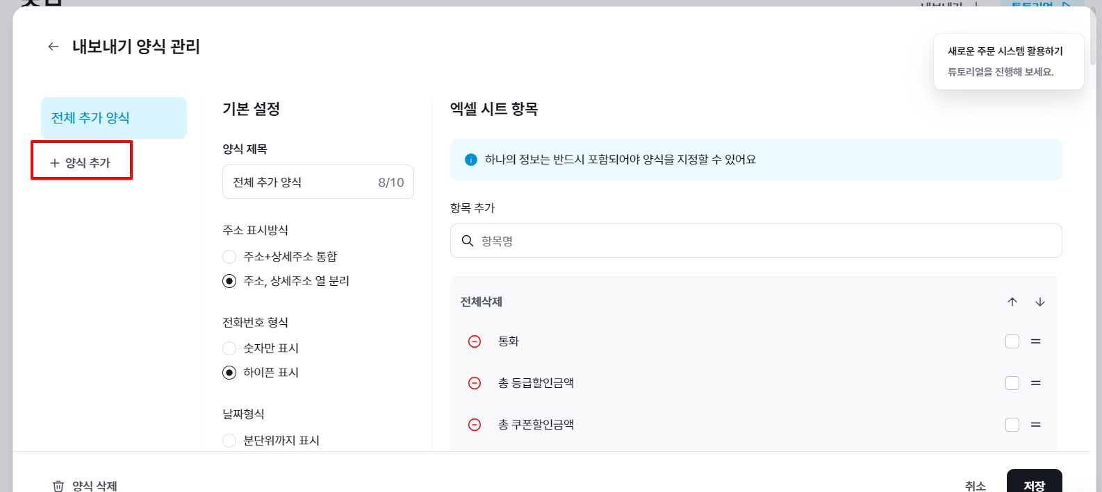 만약 기본 주문 엑셀 파일에 사용하지 않는 정보가 너무 많거나, 자주 사용하는 주문 목록 형식이 있는 경우, 주문 엑셀 다운로드 양식을 직접 만들어 사용해 보세요.