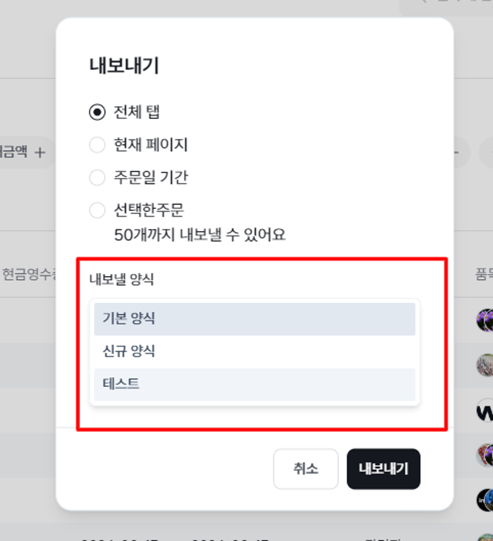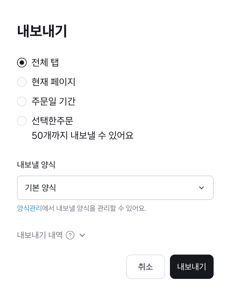 선택한 주문 | 주문을 선택한 리스트가 내보내기 됩니다. 단, 최대 50개 까지만 제공 가능해요. |