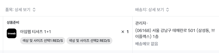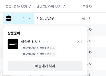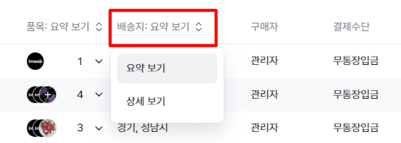 항목 중 '배송지'와 '품목'은 요약 보기와 상세 보기로 설정 가능해요. 상단 항목 부분을 클릭하여 설정을 변경해 보세요.