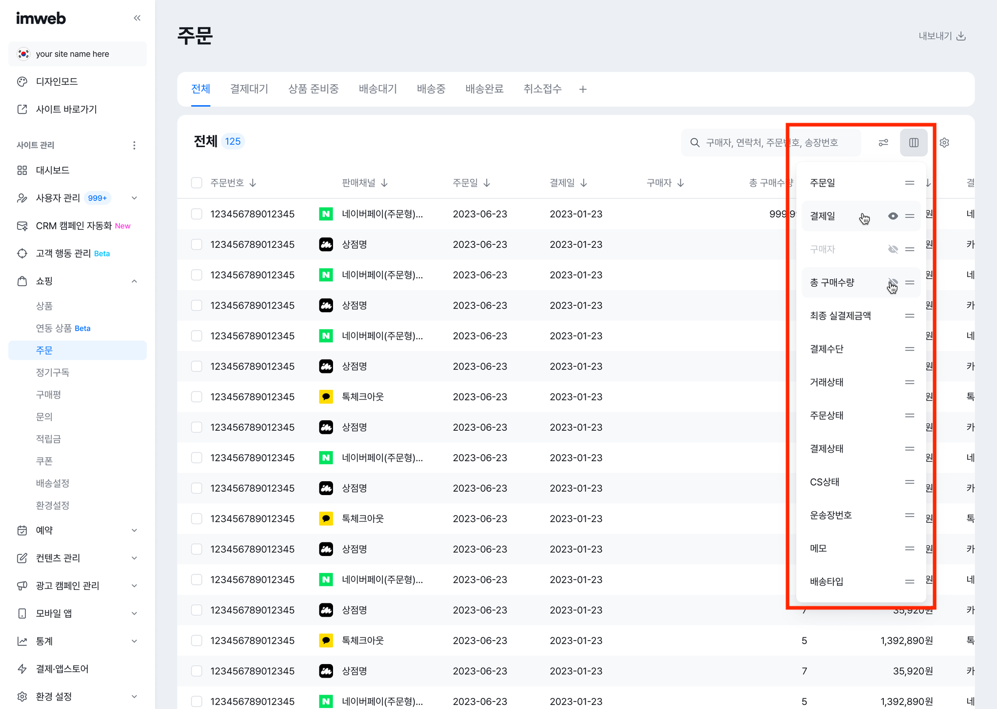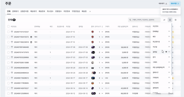 주문 목록의 열의 위치와 항목을 수정 할 수 있습니다.