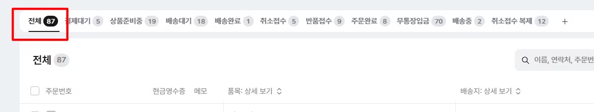 대신, 하나의 메뉴에서 여러 개의 탭을 추가하여 '전체 탭'과 같이 사용할 수 있습니다. [주문관리v2 탭 설정하기]에서 자세한 내용을 확인해 보세요.