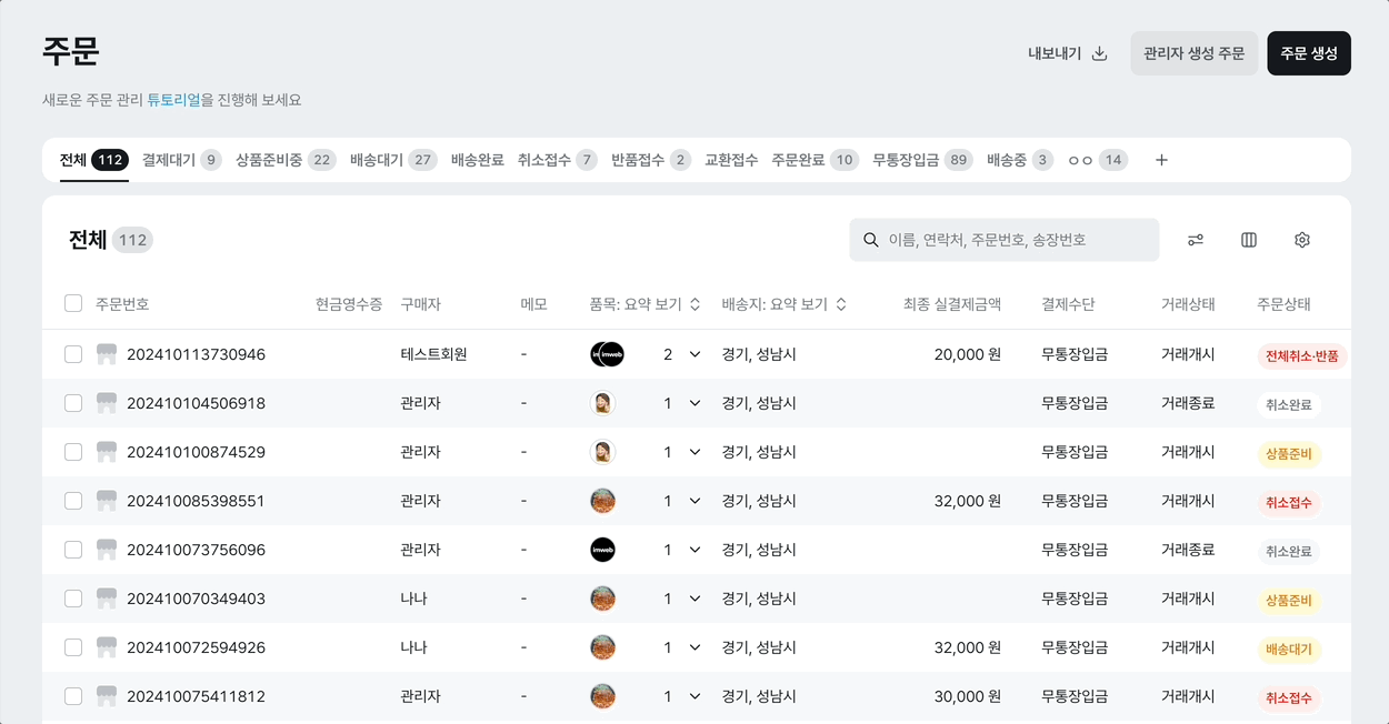 [관리자 주문 생성하기] 가이드를 참고해 주문을 생성해 보세요.