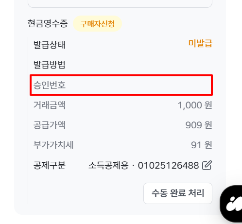 PG 미사용 사이트 혹은 수동으로 현금영수증을 발급하셨다면, 관리자가 개별로 발행 후 "수동 완료 처리" 버튼을 클릭하여 상태를 발급 완료로 변경하실 수 있어요.