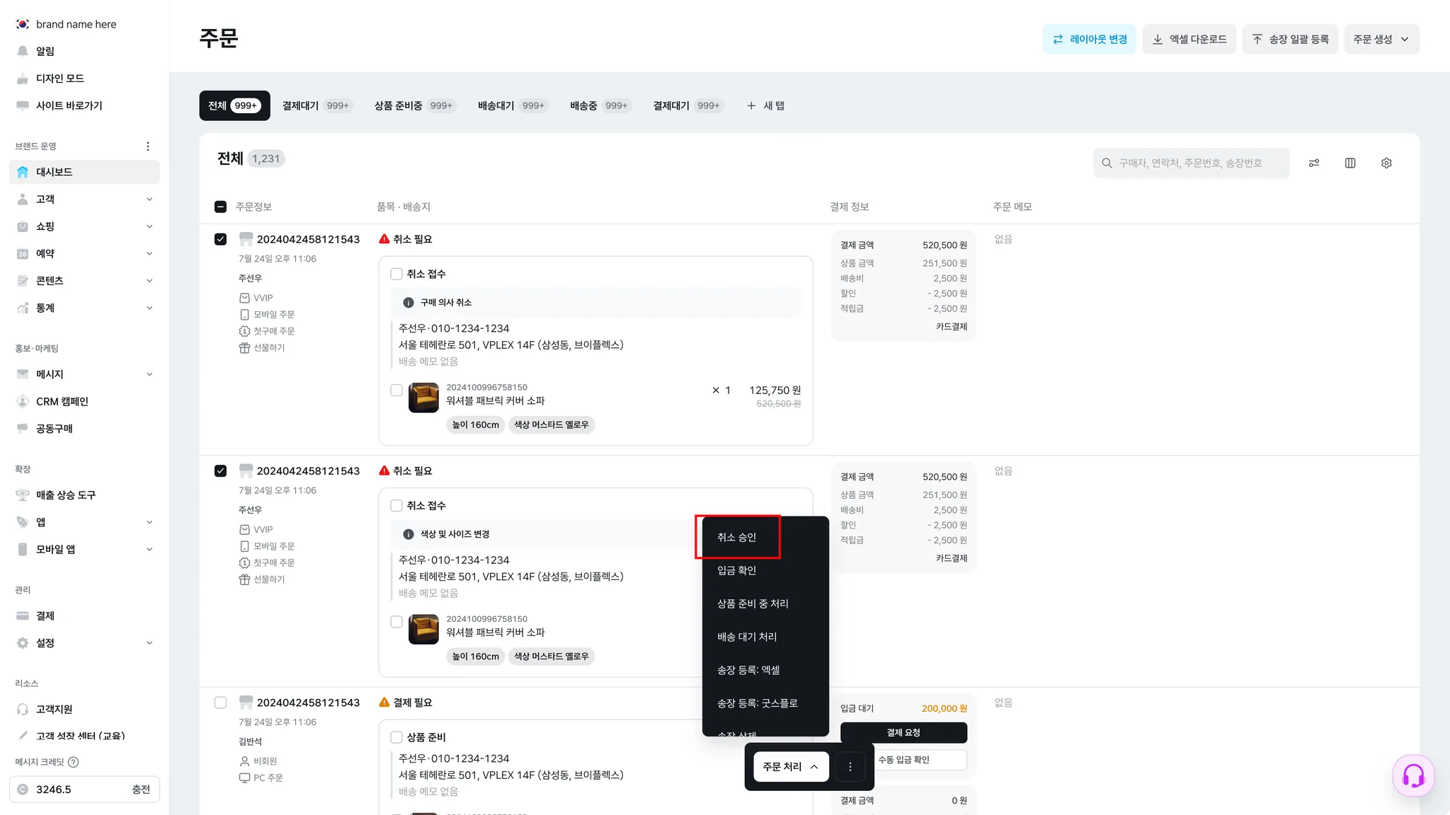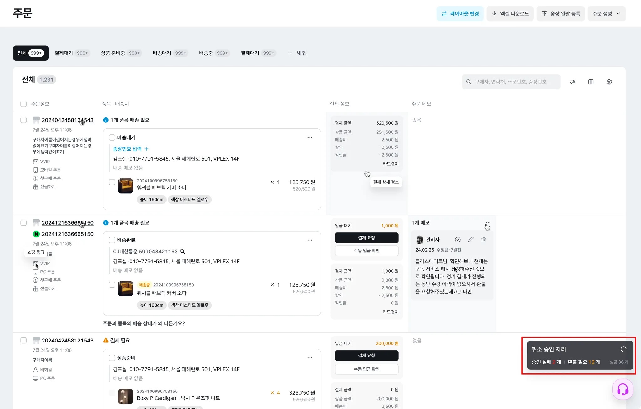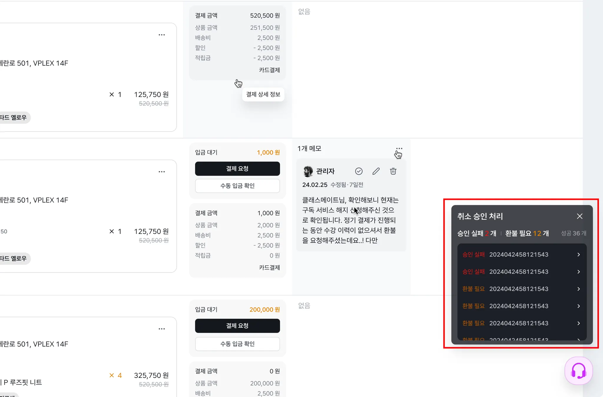 ‘취소 승인 처리’ 패널에서 주문번호를 클릭하면 해당 주문 상세페이지로 이동합니다. 환불 처리가 필요한 주문은 개별로 진행해 주세요.