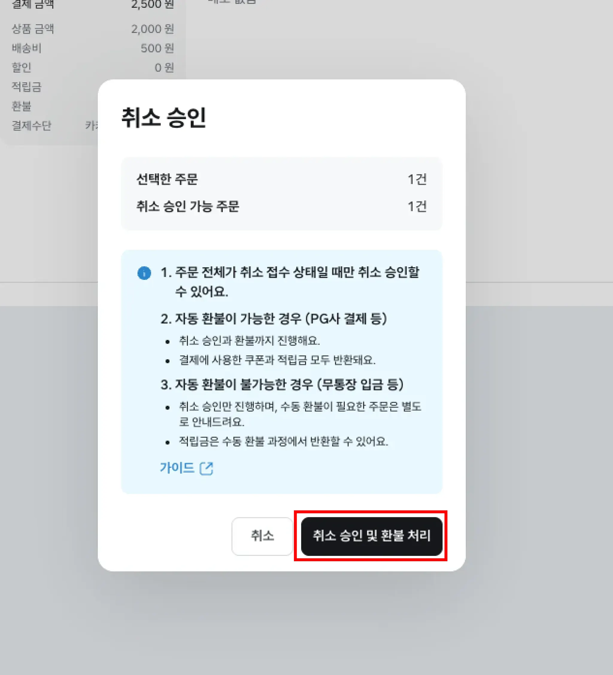 5. 취소 승인 및 환불 처리 버튼을 눌러 실행합니다.