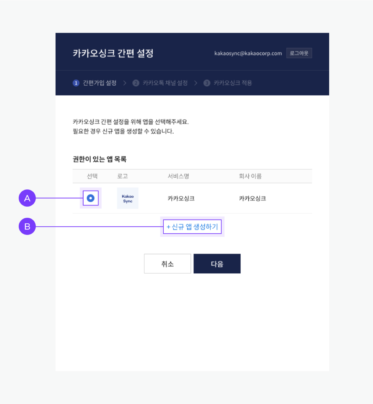 A. 기존에 쇼핑몰 앱을 등록한 경우: 카카오싱크를 적용할 앱을 선택하고, 다음 버튼을 클릭합니다.B. 쇼핑몰 앱을 새롭게 생성하는 경우: + 신규 앱 생성하기 버튼을 클릭 후 신규 앱을 생성해 주세요. 쇼핑몰 앱은 최대 10개까지 운영 가능합니다.