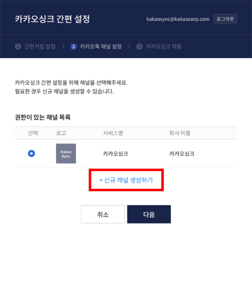 이미 운영 중인 카카오톡 채널을 선택하고, 다음 버튼을 클릭합니다.
