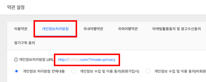 약관/개인정보처리방침 옵션에 표시된 이용약관 URL과 개인정보처리방침 URL을 마우스로 드래그하고 키보드 단축키 CTRL + C 를 눌러 복사 후 메모장 등에 기록해 둡니다.