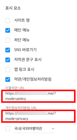 이용약관 URL과 개인정보처리방침 URL 복사를 마쳤다면 약관/개인정보처리방침 옵션을