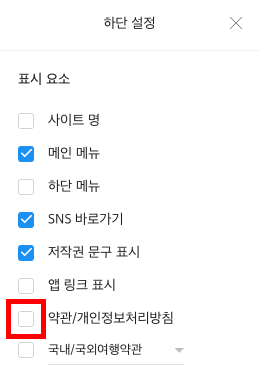 현재 내 사이트에 사용 중인 하단 디자인 형식에 따라 아래 둘 중 하나의 방법을 사용해 약관 링크를 추가해 주세요.