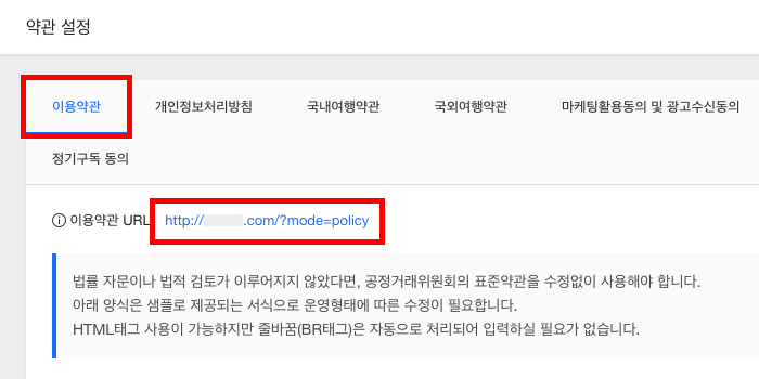 약관/개인정보처리방침 옵션에 표시된 이용약관 URL과 개인정보처리방침 URL을 마우스로 드래그하고 키보드 단축키 CTRL + C 를 눌러 복사 후 메모장 등에 기록해 둡니다.