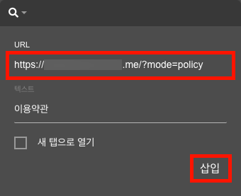 위 1단계에서 복사한 이용약관 URL을 URL 칸에 키보드 단축키(Windows: CTRL + V)를 눌러 붙여넣고, 삽입을 클릭합니다. (새 탭으로 열기 옵션은 선택하지 마세요.)