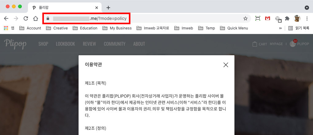이 도움말에서는 내 쇼핑몰의 이용약관 및 개인정보처리방침 URL 주소를 확인하는 방법과, 텍스트에 링크를 삽입해 브라우저 주소창에 약관 URL이 표시되도록 설정하는 방법을 안내합니다.