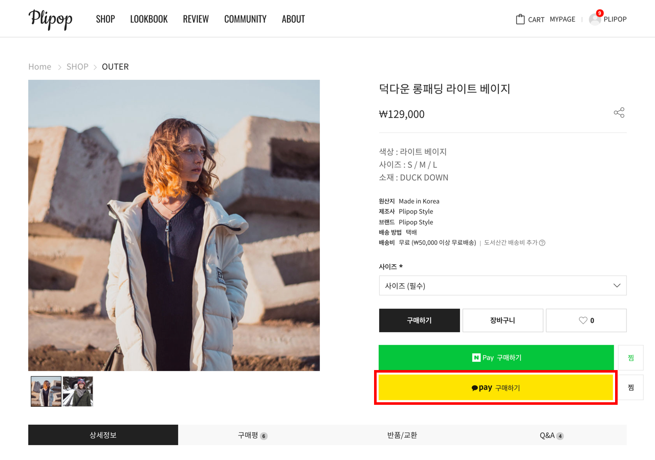 버튼 아래 카카오 페이구매하기 버튼이 표시되는지 확인하세요.
