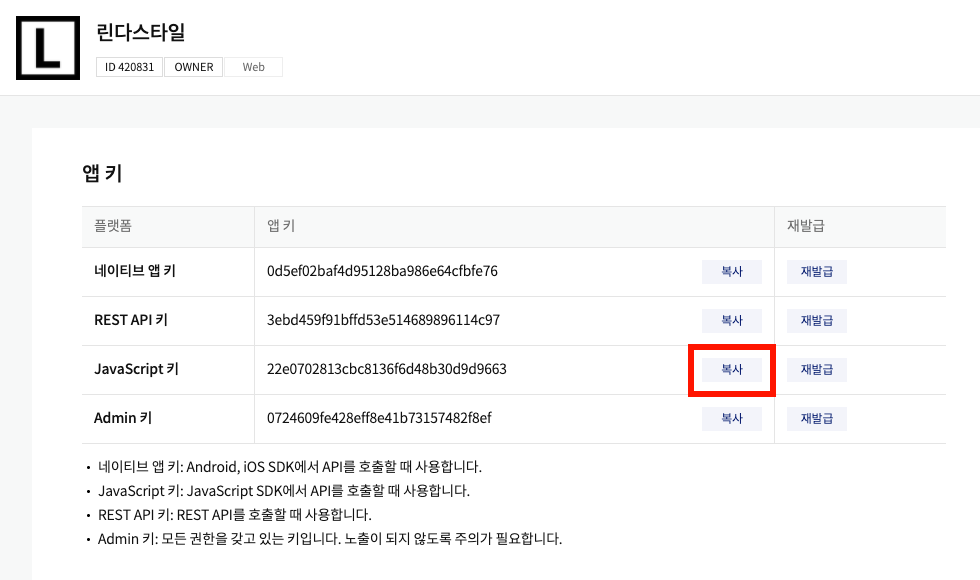JavaScript 키 오른쪽 복사버튼을 클릭합니다.