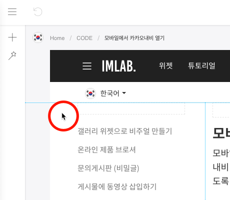 참고: 위젯에 마우스 오른쪽 버튼 클릭 시 위젯 컨텍스트 메뉴가 나타납니다. 위젯이 아닌 작업영역에 마우스 오른쪽 버튼을 클릭해 주세요.