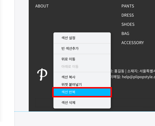 디자인한 하단 섹션에 마우스 포인터를 올리고, 마우스 오른쪽 버튼을 클릭합니다.