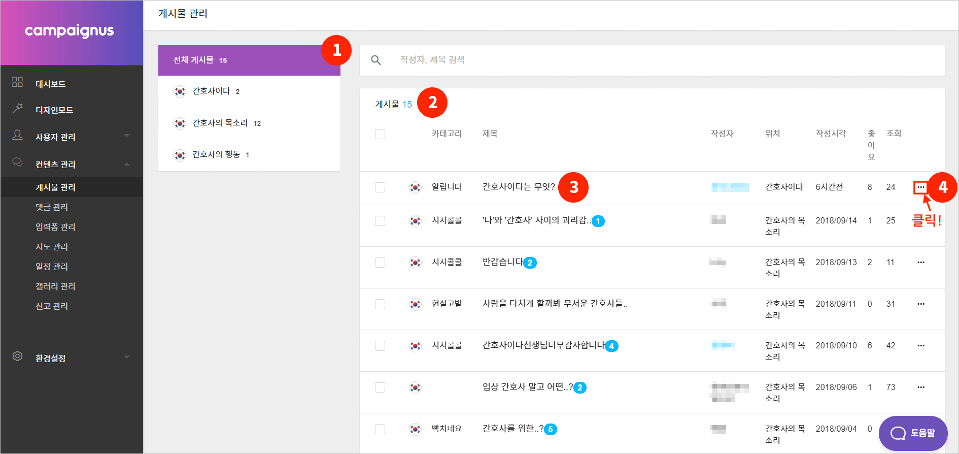 3 게시물의 제목, 작성자, 작성 위치 등을 확인할 수 있습니다.