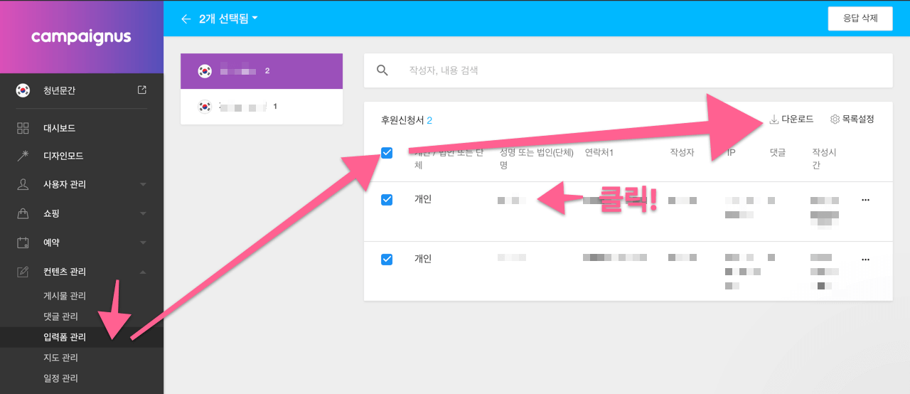입력폼 위젯을 통해 사용자로부터 접수된 응답은 입력폼 관리에서 확인 가능합니다. 입력폼 관리에서는 생성된 입력폼의 목록이 나타나며, 선택하여 일괄 다운로드 받거나 입력폼명을 눌러 접수된 세부 내용을 볼 수 있습니다.