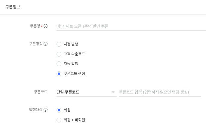 쿠폰코드: 단일 또는 여러 쿠폰코드 중 하나를 선택해 생성할 수 있습니다.