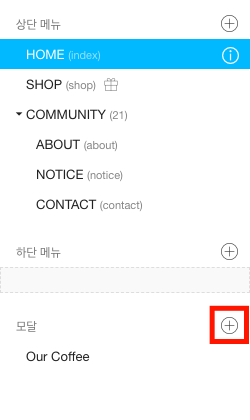 왼쪽 윗부분 메뉴 관리를 클릭해 메뉴 관리 창을 열고, 맨 아래 부분 모달의 오른쪽 ⊕ 아이콘을 클릭합니다.