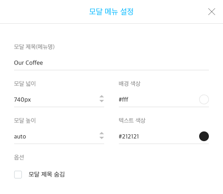 (선택 사항) 모달 메뉴의 메뉴 설정을 열어, 모달 제목, 모달 넓기, 배경색 등 설정을 변경할 수 있습니다.
