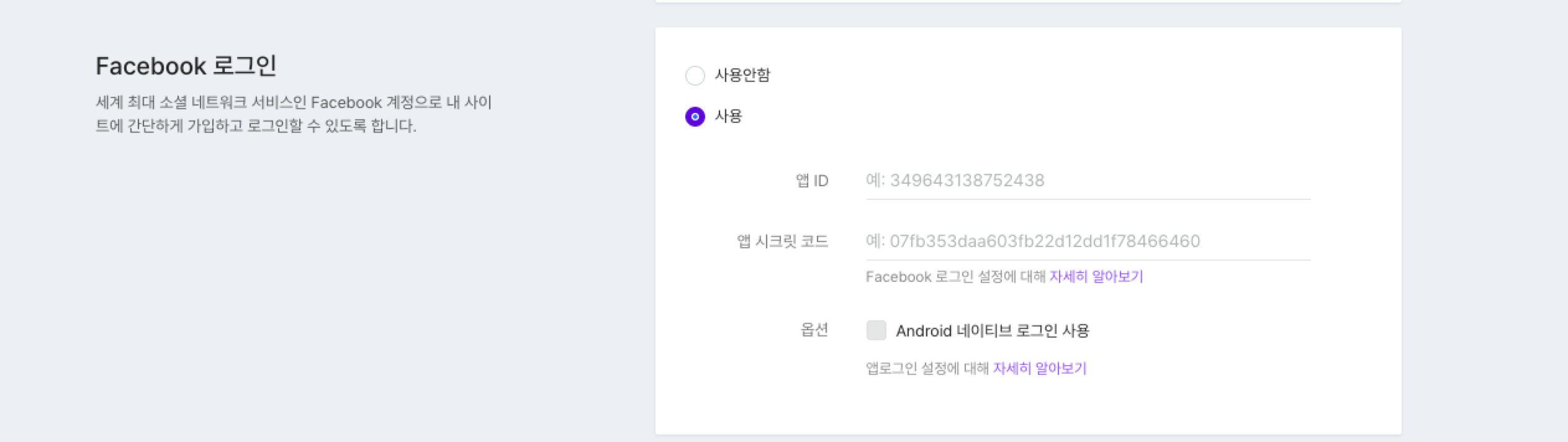 2. [관리자 페이지 > 환경설정 > 소셜 로그인·지도·공유 > facebook 로그인] 항목 사용여부를 on 으로 변경한 후 복사한 앱 ID와 앱 시크릿 코드를 입력 후 저장해 주시면 페이스북 로그인 설정이 완료됩니다.
