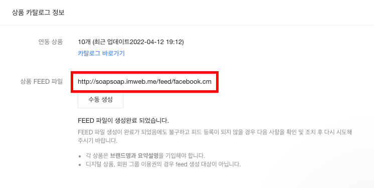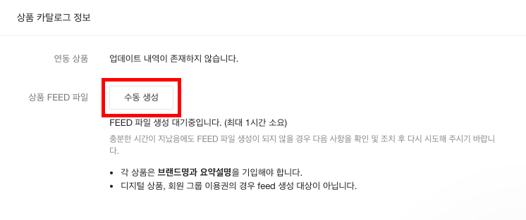상품 카탈로그 정보에서 상품 FEED 파일의 수동 생성 버튼을 클릭합니다.