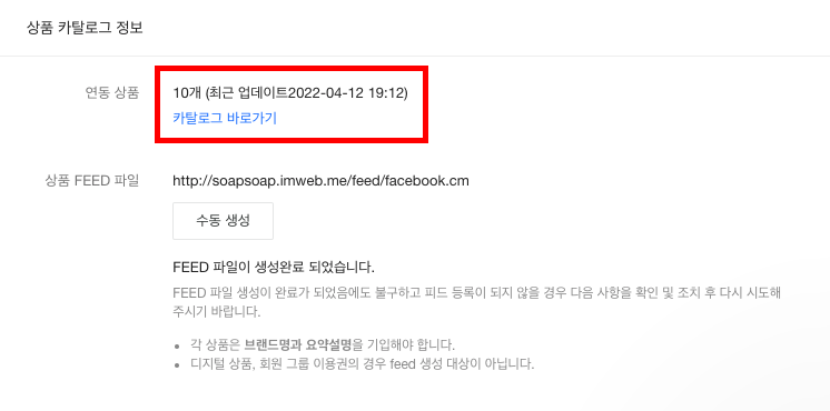 상품 FEED 파일이 생성되면 연동 상품 개수가 표시됩니다. 여기서 카탈로그 바로가기