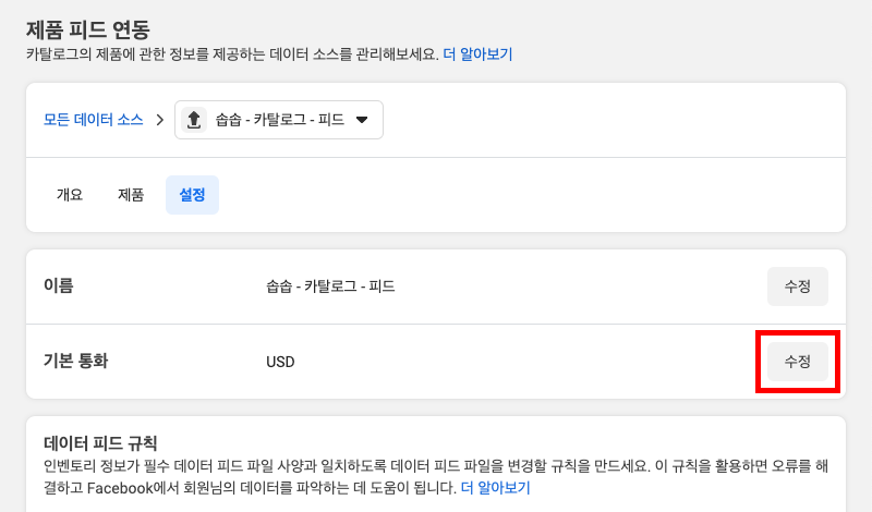 참고: ‘상품 FEED 파일 URL’은 내 캠페이너스 쇼핑몰에 등록한 상품의 정보가 담긴 주소를 의미합니다. Meta에서는 이 FEED 파일 URL을 지정한 시간에 불러와 내 최신 상품정보를 가져옵니다.