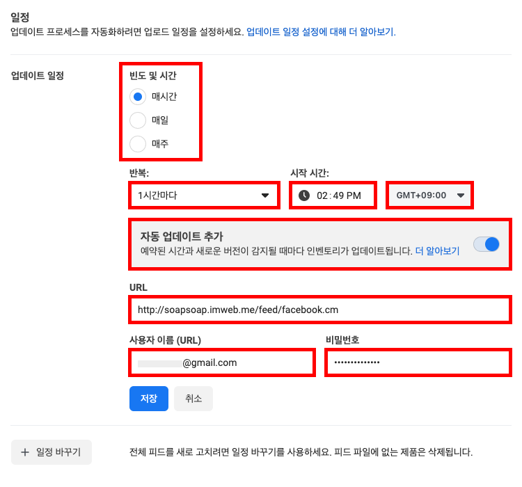 URL: 위 1단계 5번 과정에서 복사한 상품 FEED 파일 URL을 입력해 줍니다.