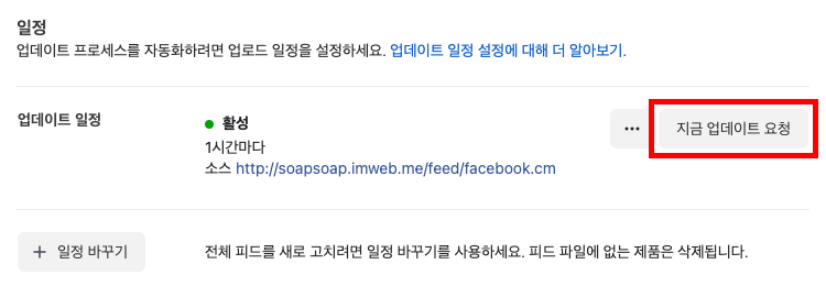 참고: 지금 업데이트 요청을 하지 않으면 위 7번 과정에서 설정한 시작 시간을 기준으로 상품정보 업데이트 및 연동이 시작됩니다.