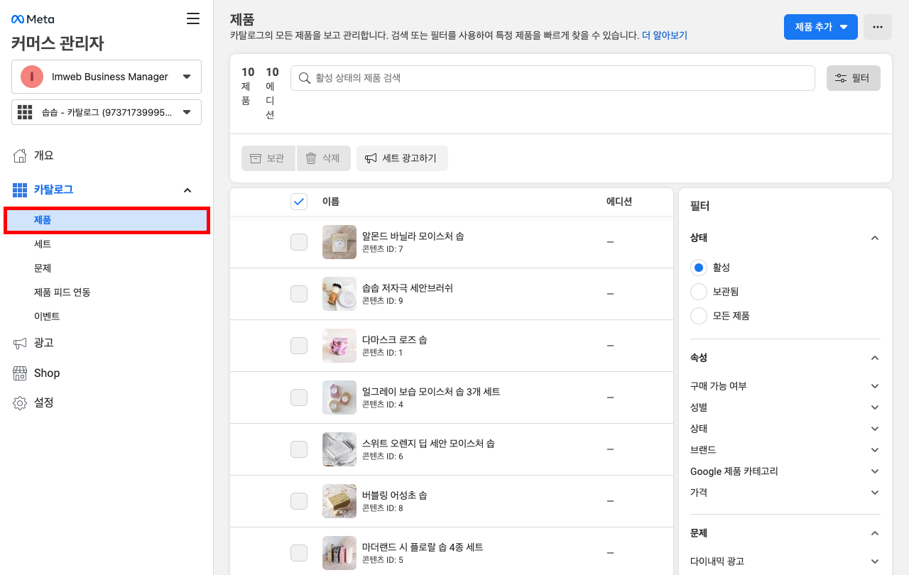 축하합니다! 상품 연동이 완료되면 왼쪽의 [카탈로그 > 제품]에 상품이 추가된 걸 확인할 수 있습니다.