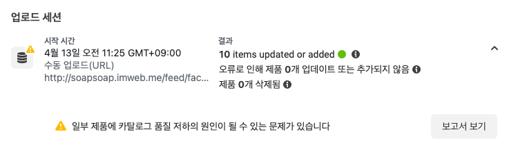 아래 그림과 같이 카탈로그 품질 저하의 원인이 될 수 있는 문제가 있다, 는 보고서가 표시될 수 있습니다. 이때 보고서 보기 버튼을 클릭 후, 보고서 다운로드 버튼을 클릭해 정확한 문제를 파악할 수 있습니다.