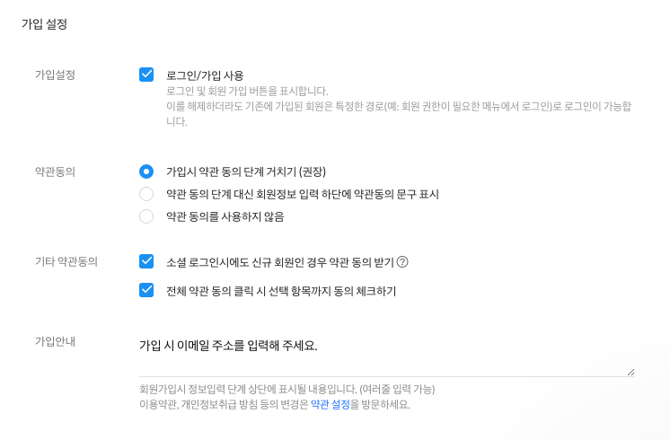 약관동의: 회원가입 시 약관에 동의하는 방식을 선택합니다. 특별한 경우가 아닌 한 가입시 약관 동의 단계 거치기를 선택하는 것을 권장합니다.