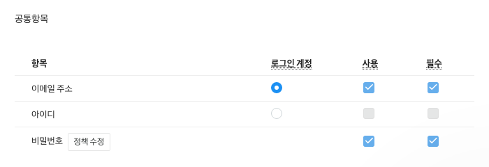 회원가입 시 필요한 가입 항목에 사용 체크박스를 선택합니다.